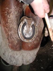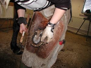 Naulaaminen aloitetaan sisähaaralta. Kun kenkä on kiinni kahdella naulalla lasketaan jalka maahan ja tarkistetaan että se on suorassa.